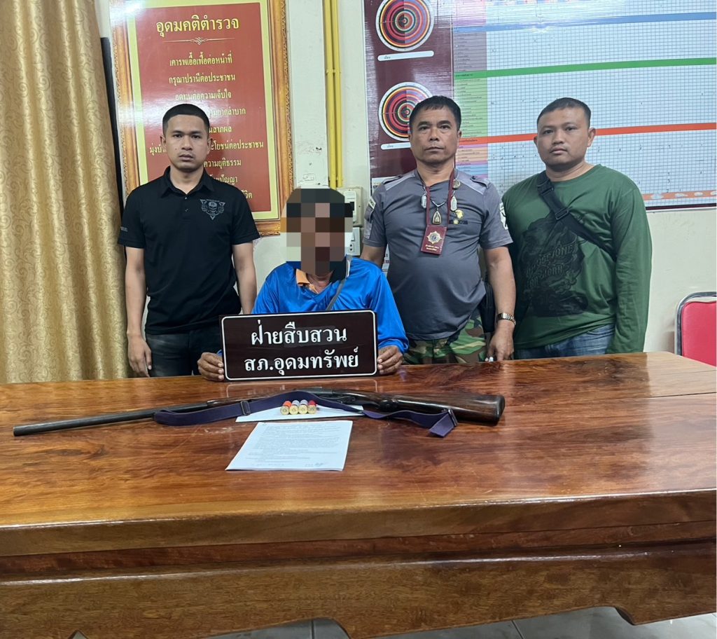 วันที่ 13 ธ.ค.2567 ชุดสืบสวน สภ.อุดมทรัพย์ ได้จับกุม นายสง่า จีบตะคุ อายุ 51 ปี ได้ที่ไร่มันท้ายหมู่บ้านบะด่าน ต.อุดมทรัพย์ ซึ่งมีปืนลูกซองยาวและกระสุน 4 นัด ได้แจ้งข้อหาว่ามีอาวุธปืนและเครื่องกระสุนปืนไว้ในครอบครองฯ